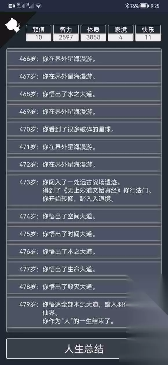 最佳加点方式: 智力能依靠天赋大于10时,智力加到10,体质尽量点高保证活到100岁,颜值能提高奇遇的概率,若有多余可以点高,最后考虑家境不死就行。 天赋选小盒子,美籍华人,加点1,9,10,0 因为大道压制,当世法比古法更容易成仙,所以智力保持≤10,可以避免触发买秘籍事件 古法需要智力10以上,必须点加智天赋,或者看脸刷随机事件,即使悟出混沌大道才能去界外,全靠运气,即使悟出来了,也很难找到别的修行法,经常蹉跎百年到寿元耗尽,正常情况下很难出 当世法可以靠悟出天道稳定成仙,触发条件为微观领域突破、诺贝尔物理学奖,极大提高属性,可稳定达到渡劫需要,且可以不满足五行+本源大道,也可以度过天劫