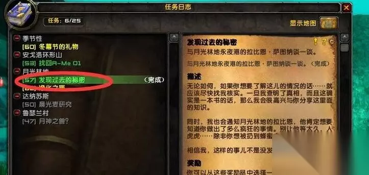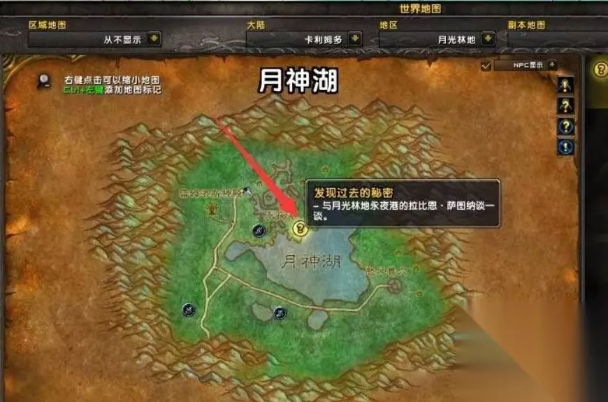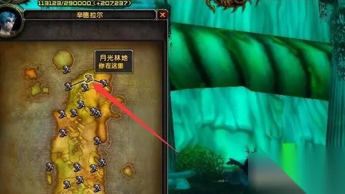 3、到达月光林地后,打开小地图,沿着我的标记快速找到任务点。