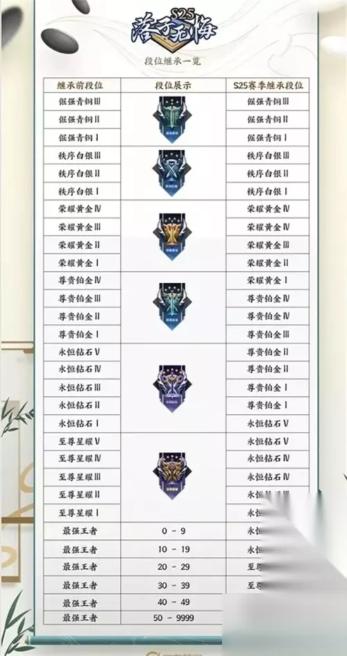 S25赛季主题名为落子无悔,继承规则没啥变动,还是和以往的S24赛季一样:最强王者0-10星会掉到钻石二,荣耀王者会掉到星耀二。星耀会掉到钻石三-钻石五。 由于后续的S26/S27/S28赛季都属于落子无悔这一个赛年,因此后续的赛季都是按照这个掉段机制来继承的。届时后续几个赛季更新的时候,也可以按照这张表上来参考。 言归正传,S25赛季大部分召唤师都会掉一个大段位,这样在新赛季才会有上分的动力。至于钻石奖励,已经不是通过结算的方式给了,而是通过完成赛季任务给。 【小编推荐】专区入口 || 视频站入口 || 体验服申请入口 || 全民竞猜赢好礼 【新英雄爆料】| 司马懿 || 瑶 || 孙策 || 新英雄:囚徒/书圣/瞬 | 【新皮肤爆料】| 李白团战皮肤:敏锐之力new || 诸葛亮团战皮肤:掌控 || 典韦穷奇皮肤 Hot!! | 王者荣耀最新攻略 赛季段位继承表 每日一题 边境突围玩法攻略 体验服爆料