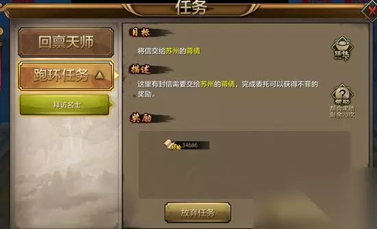 升级重点 最后需要重点介绍的是每周跑环任务,这是游戏中目前可以获得经验最多的活动任务,每周可以接取一次。可以完成300轮的跑环任务,没完成一轮都可以获得经验值,完成的次数越多,获得的经验值也就越多。接取任务的时候需要花费2万的银两,并且在任务的过程中,需要的很多任务物品都可以用银两在交易商店中购买,完成300轮任务需要的银两还是比较多的。每完成100轮任务会获得一些道具奖励。需要注意的是,跑环任务,每周一刷新次数,如果当前的任务没有做完的话,也不会清除掉,可以继续做,在全部完成之后,还可以从新接取,不用放弃掉。