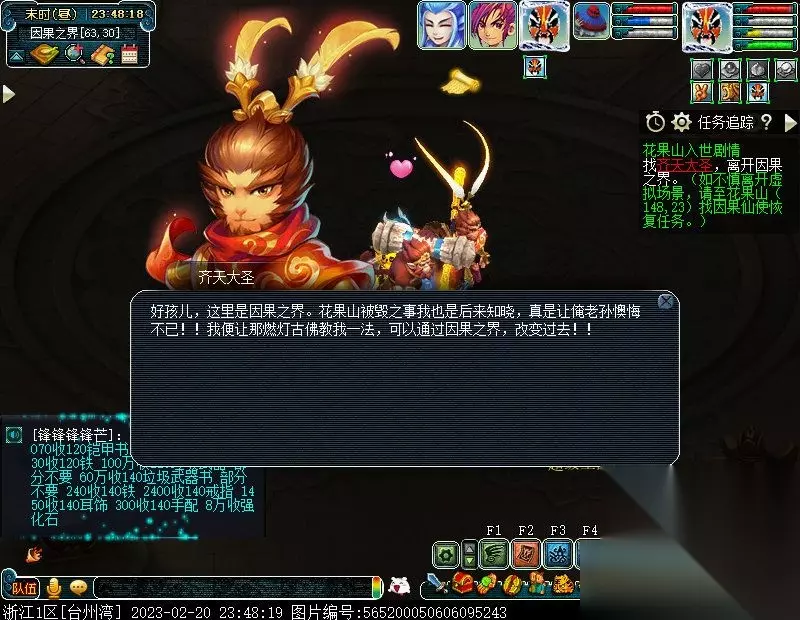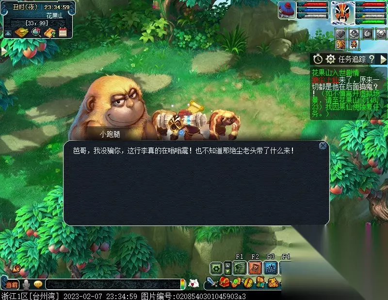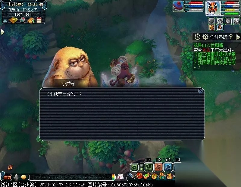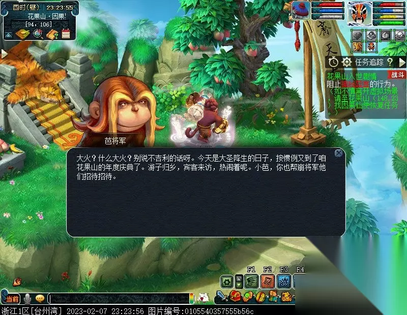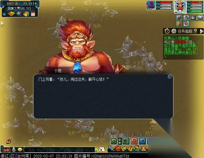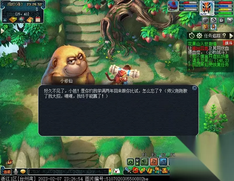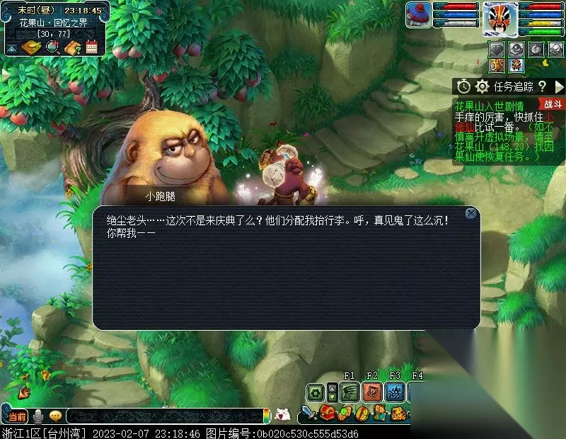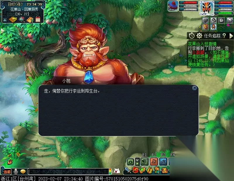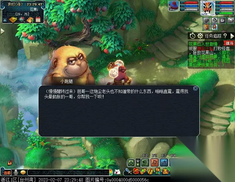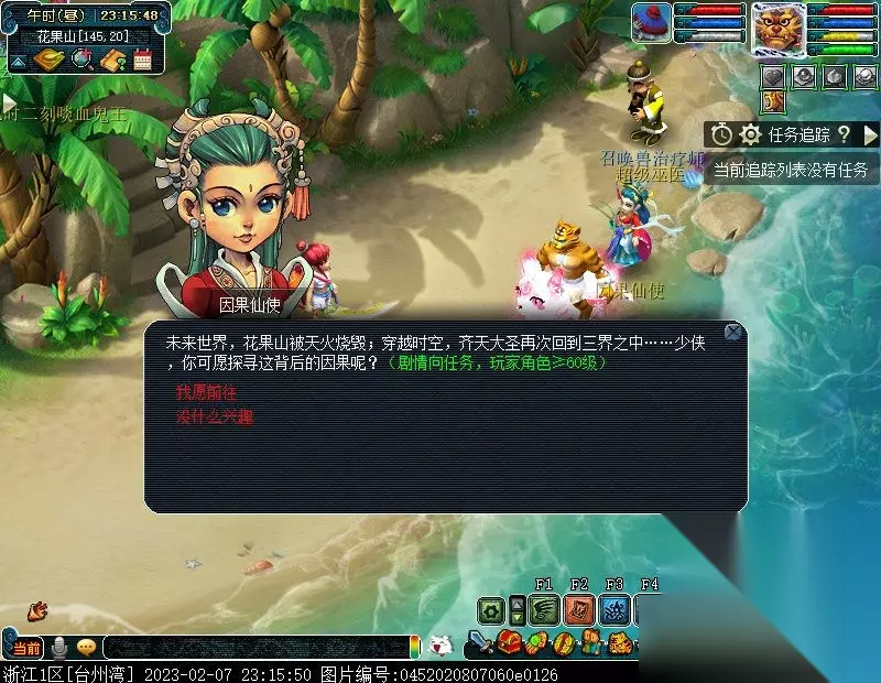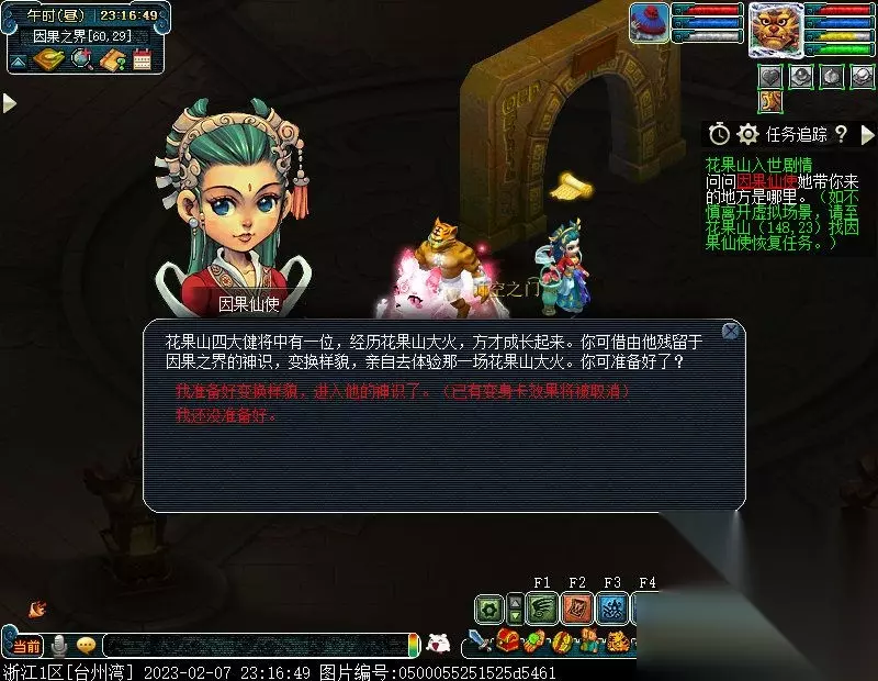 特别提醒:此后,如若不慎离开虚拟场景,均可至花果山(148,23)找NPC因果仙使进入虚拟场景以及恢复任务。 2.问问因果仙使她带你来的地方是哪里。〔对话〕