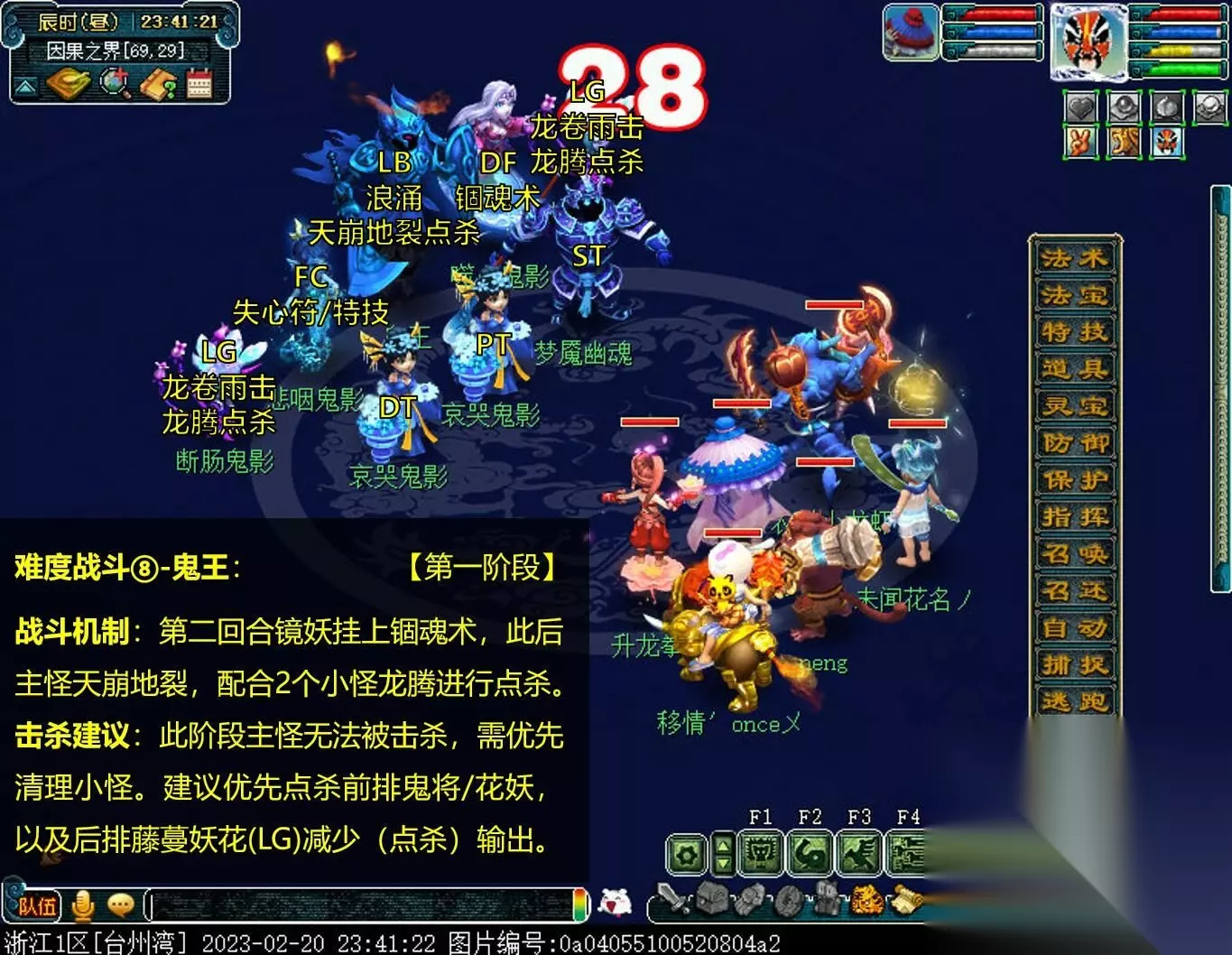 难度战斗⑧-鬼王:【第一阶段】 战斗机制:第二回合镜妖挂上锢魂术,此后主怪天崩地裂,配合2个小怪龙腾进行点杀。 击杀建议:此阶段主怪无法被击杀,需优先清理小怪。建议优先点杀前排鬼将/花妖,以及后排藤蔓妖花(LG)减少(点杀)输出。