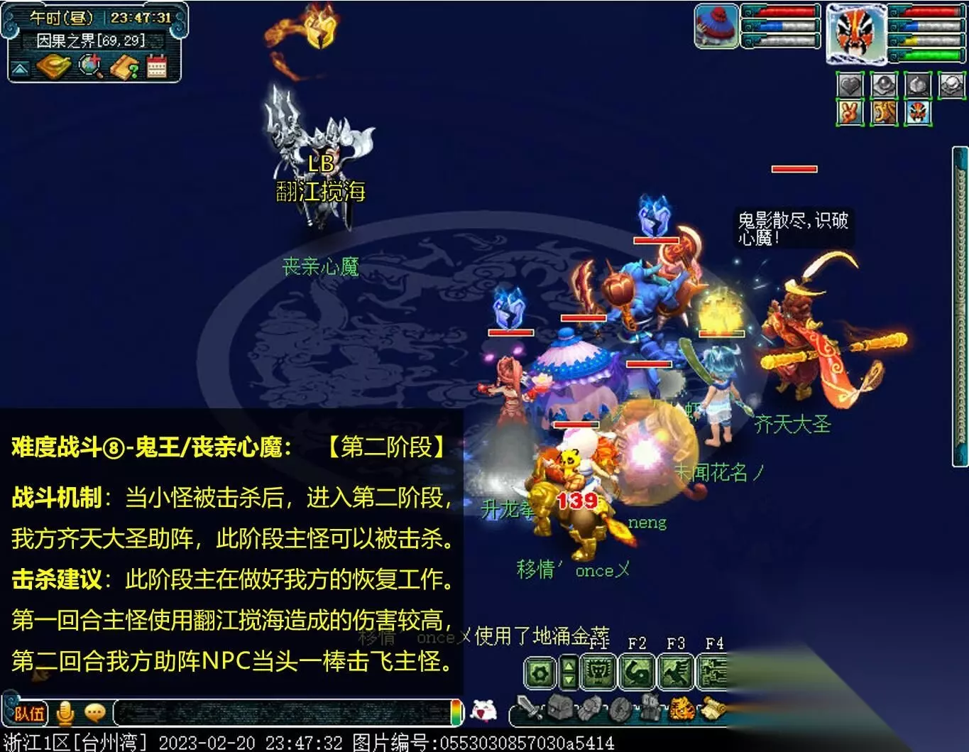 难度战斗⑧-鬼王/丧亲心魔:【第二阶段】 战斗机制:当小怪被击杀后,进入第二阶段,我方齐天大圣助阵,此阶段主怪可以被击杀。 击杀建议:此阶段主在做好我方的恢复工作。第一回合主怪使用翻江搅海造成的伤害较高,第二回合我方助阵NPC当头一棒击飞主怪。 33.找齐天大圣,离开因果之界。〔对话,剧情结束〕