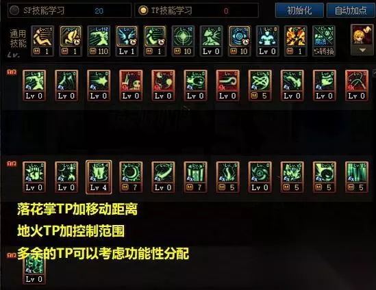 输出时,建议优先放冷却短的技能,后面可以再放一次。如果可以轻松秒,可以优先放伤害高的技能。在同样的技能数量的情况下,耗时比较短的战术是先放很慢的脱手技能,再放站桩技能。比如水晶+护石南瓜+三觉偷跑或者提前憋一个天雷,下一个冷却好了就可以连续放两个。带护石的天雷在伤害/冷却上最强,实用性上,虽然范围小但是单段还算容易打中,再按技能键攻击,可以不移动原地劈,用熟了实际情况不喜欢再考虑不点。实战怪物开场无敌,可以提前放三觉等延迟技能,俗称偷跑,打伤害比较快。加点包括两种,续航与爆发,异同在于元素震荡与元素帷幕之间的取舍,在爆发上,元素震荡以其优秀的数据,使得爆发能力非常强,但是基本上没有什么续航能力。而帷幕虽然也是一个比较墨迹的技能,但是它是一个脱手的技能。对于短时爆发而言,元素震荡搭配护石,或许是一个不错的选择。 通用加点 落花掌TP加移动距离 地火TP加控制范围 多余的TP可以考虑功能性分配