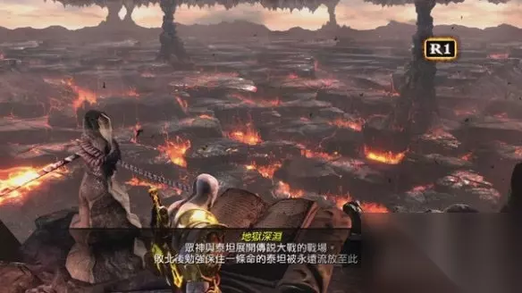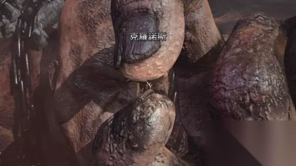 飞越过一个沟壑,抵达一个泰坦巨人手部的位置,此时手部突然动了,托起奎托斯的是一个庞然大物,然而镜头拉远之后才得以看到这个庞然大物的一个脑袋,赫然就是第二代神王-“克洛诺斯”