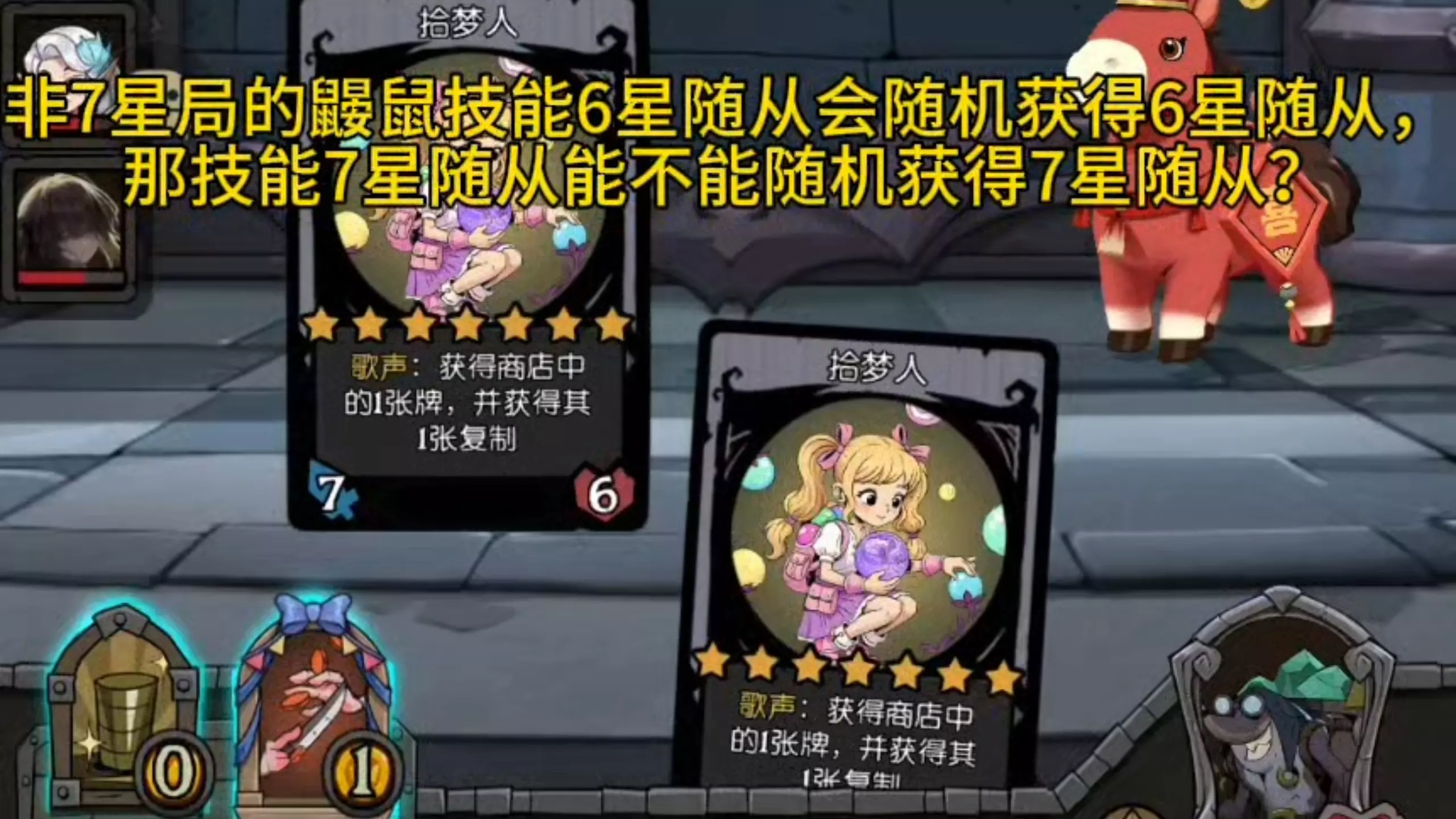 这是一则游戏相关的疑问帖,玩家在7星商店界面中,发出疑问:使用古堡三杰的技能,能不能挑选7星随从,界面中展示了多款不同技能的7星级随从卡牌。