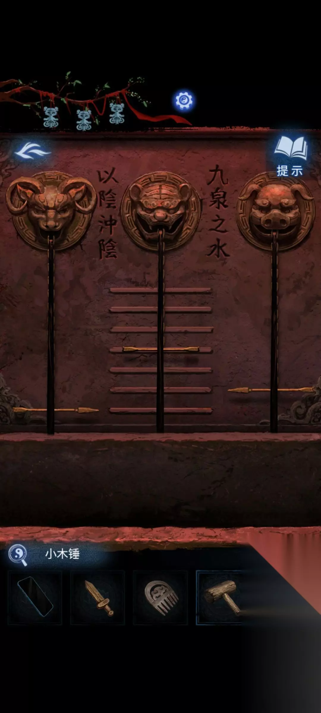12:将杖头木偶放在弃煞牢最左侧的戏台上,根据话语中的动作提示来点击(1.睁眼,张口。2.睁眼,张口,抬右臂。3.闭眼闭口不抬臂)完成后获得,小铜棒,小木槌,万字钥匙