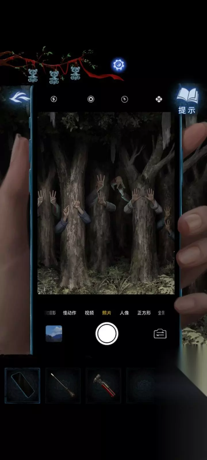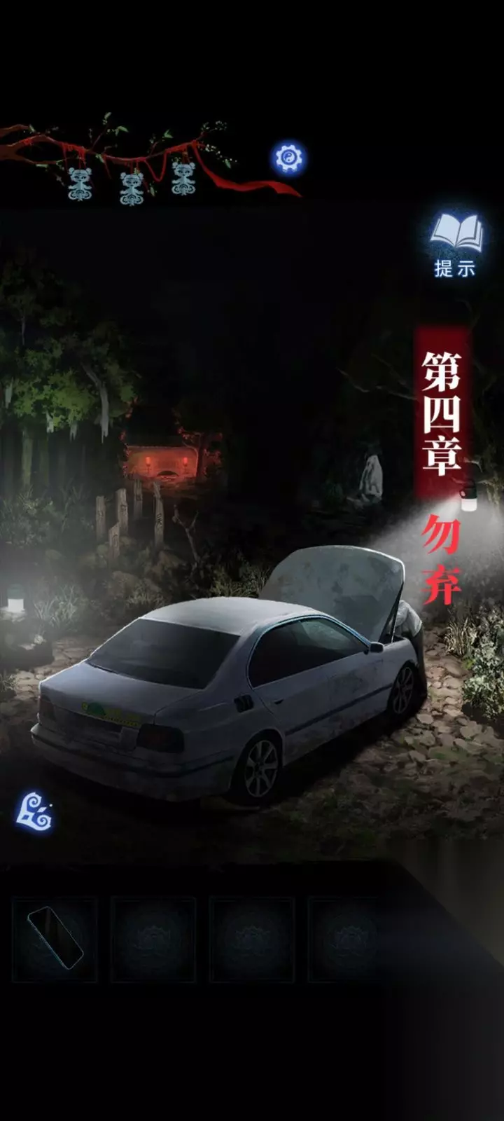 7:在汽车左侧的树林里,再次使用手机观察,获得线索。在弃煞牢场景中对桌子上黄金盒子使用安全锤,获得太极戒指点击右侧的书获得线索。