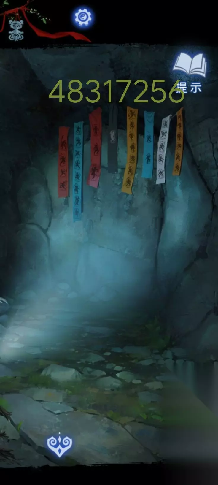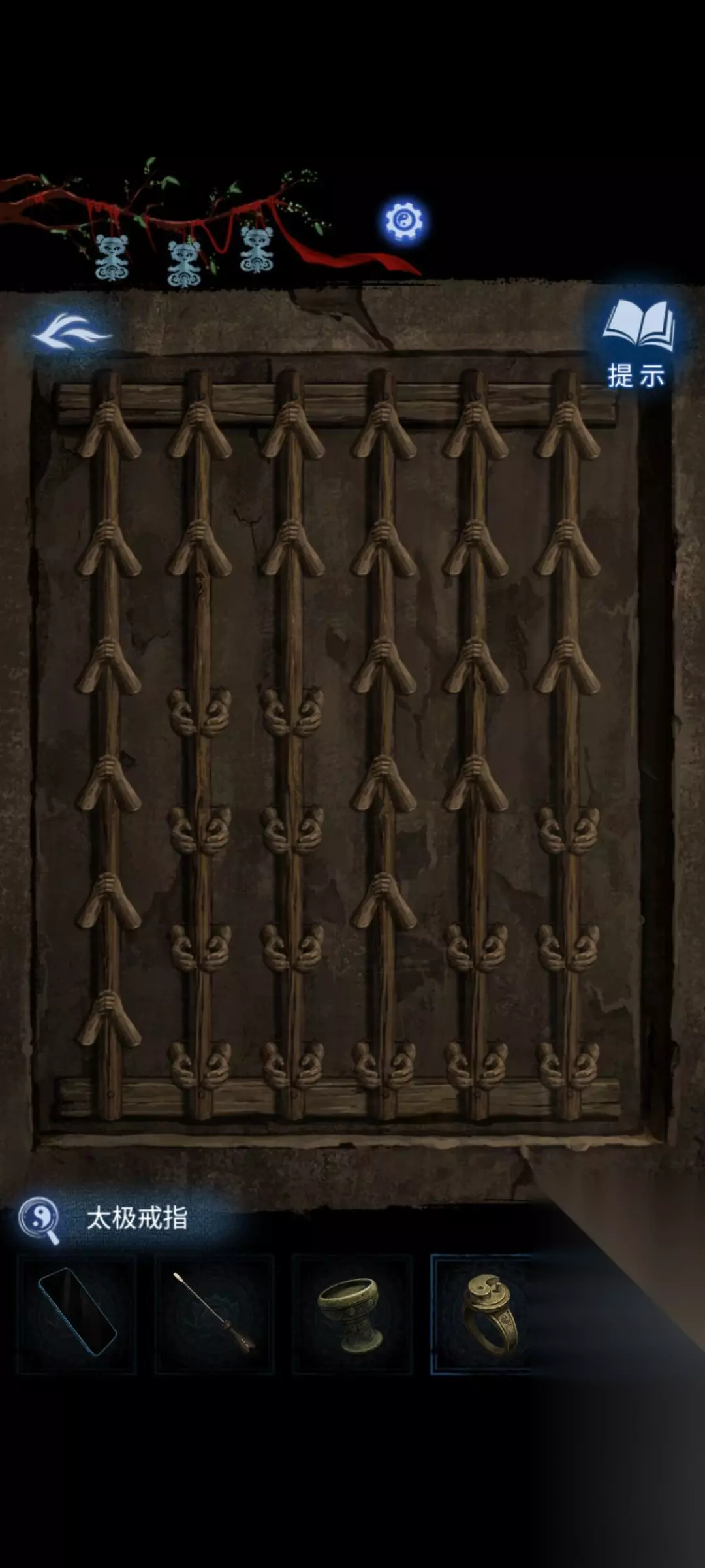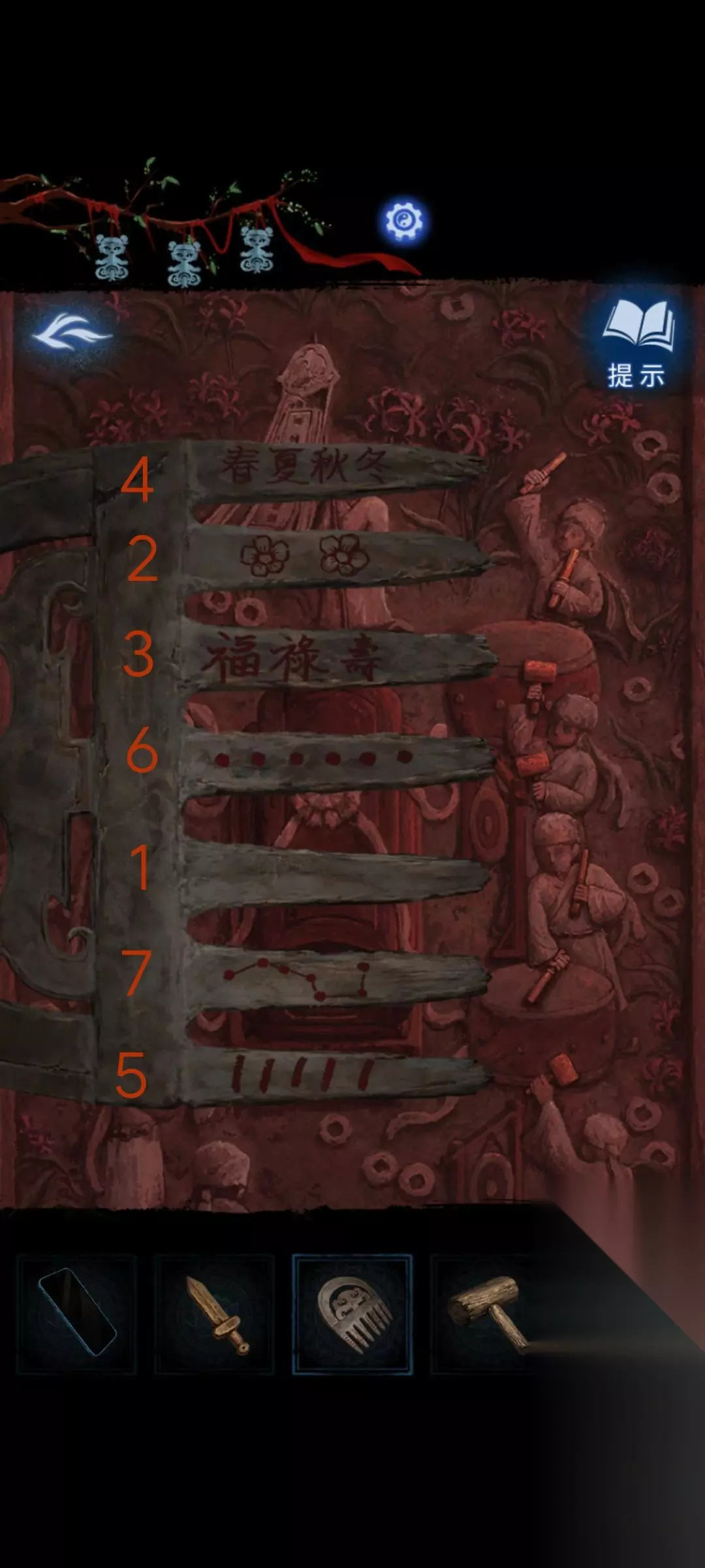 8:点击场景里正前方类似于绳结一样的机关,根据线索可以得出(622543)完成后获得浆糊和符纸。小桃木剑。