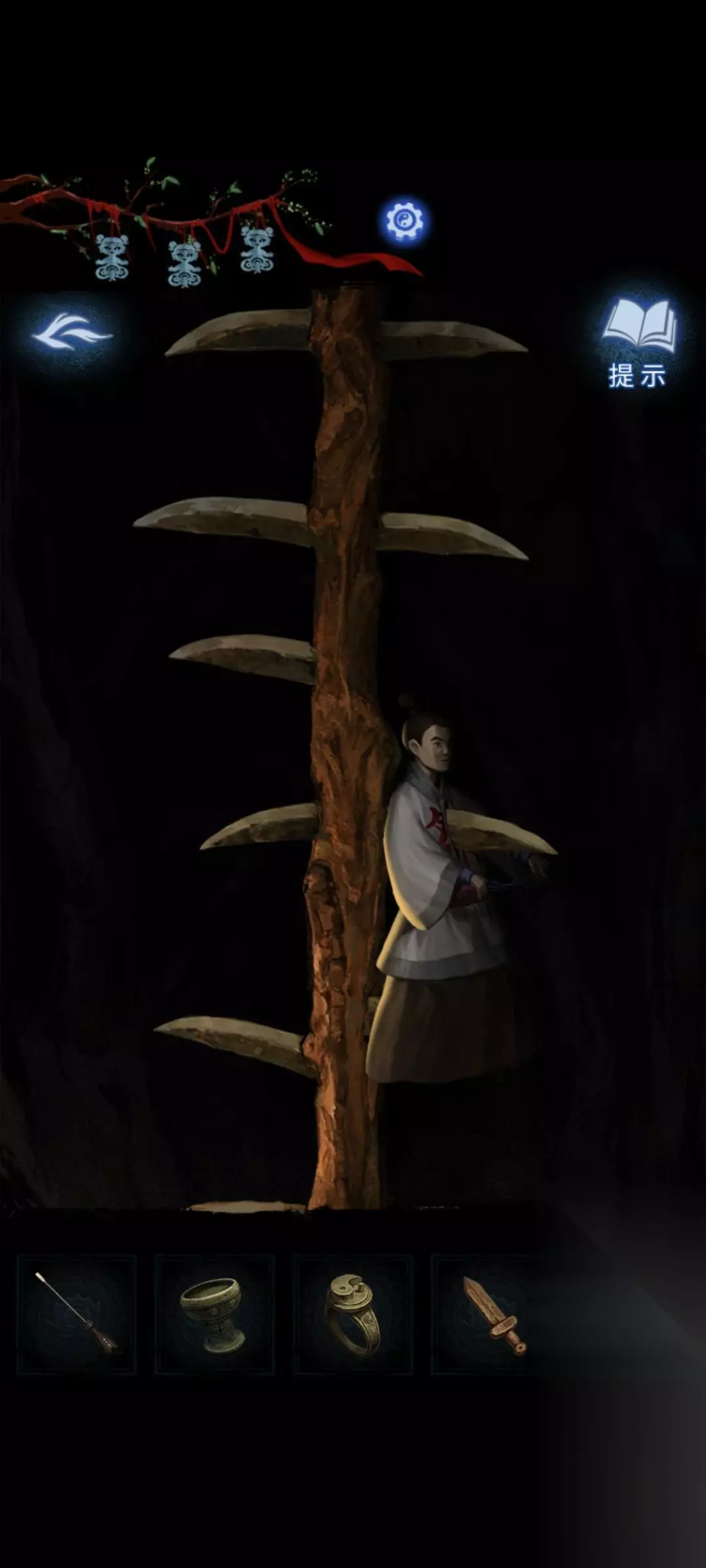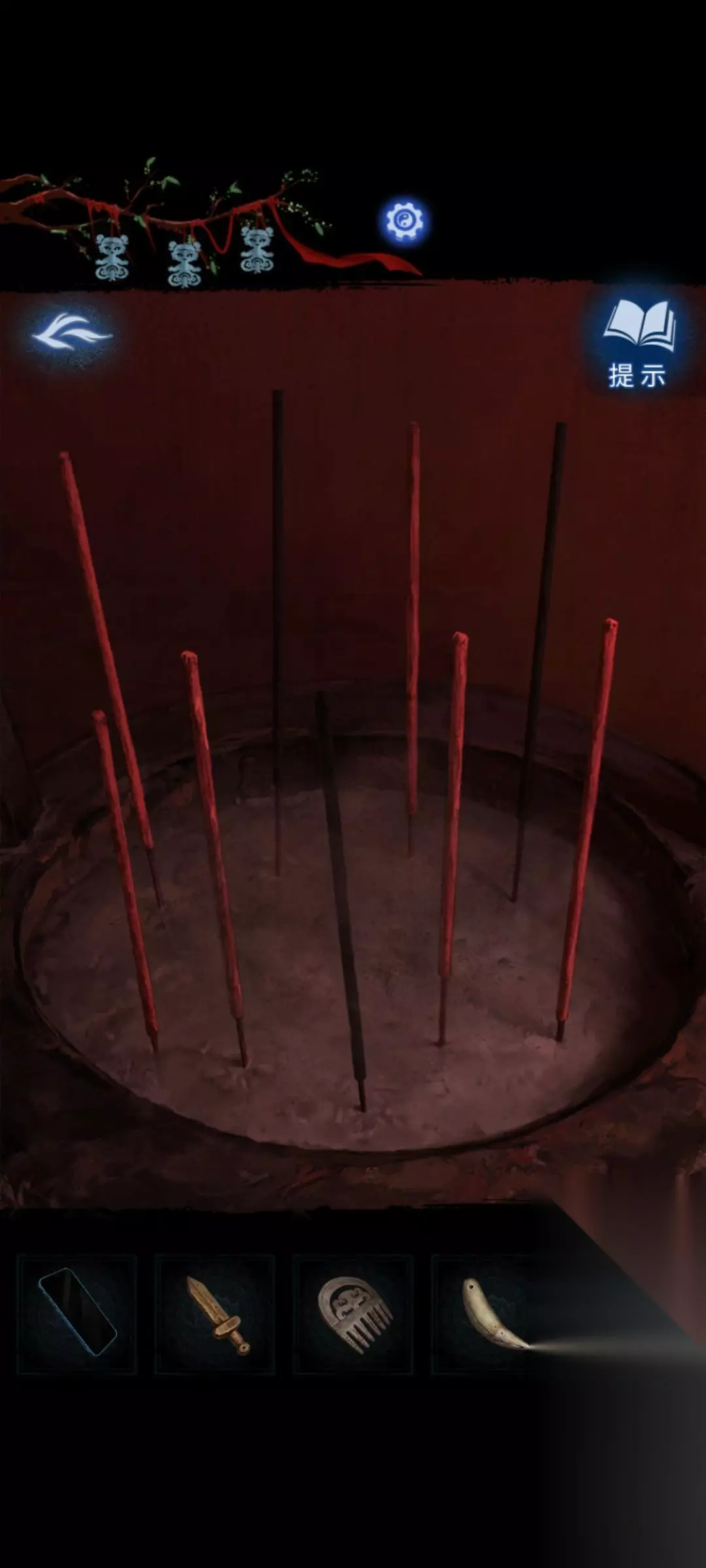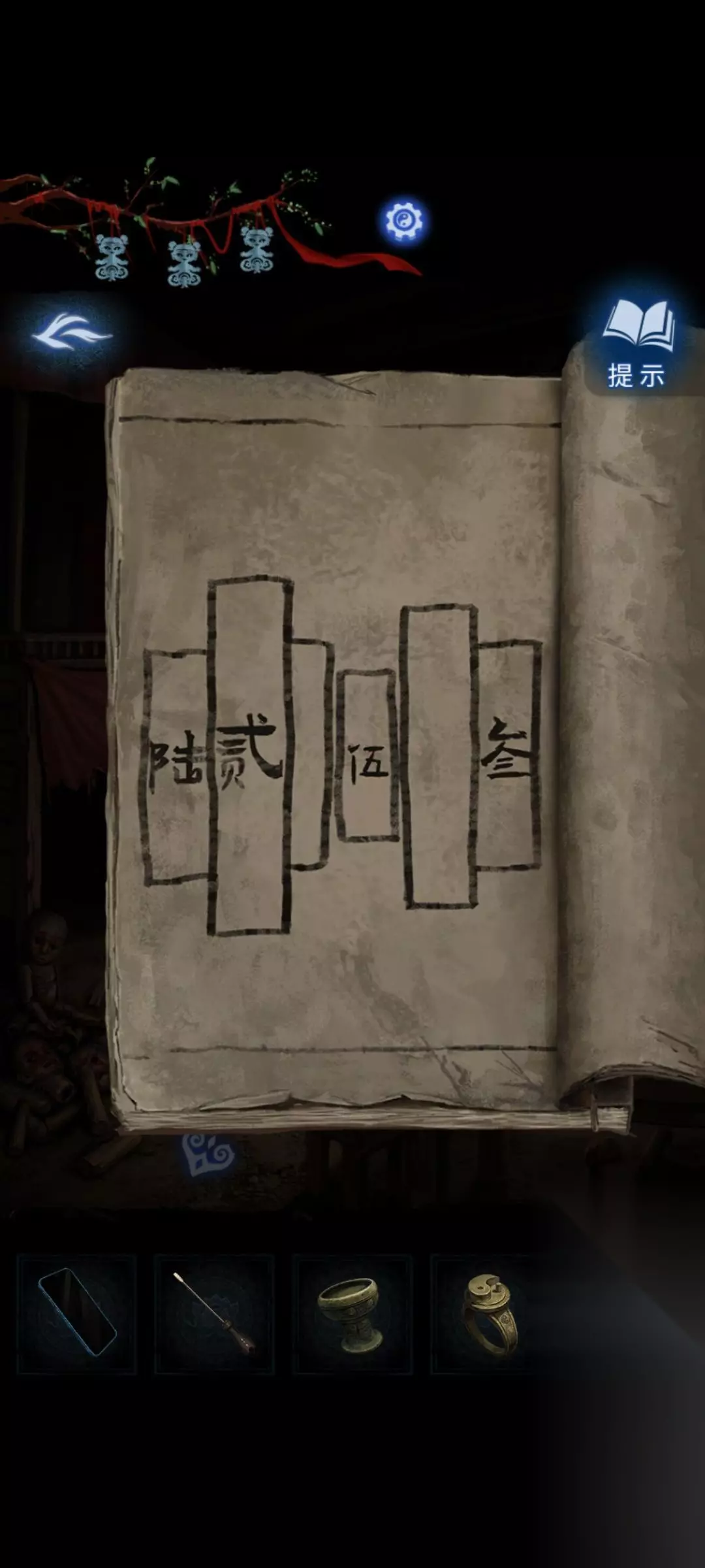 8:点击场景里正前方类似于绳结一样的机关,根据线索可以得出(622543)完成后获得浆糊和符纸。小桃木剑。