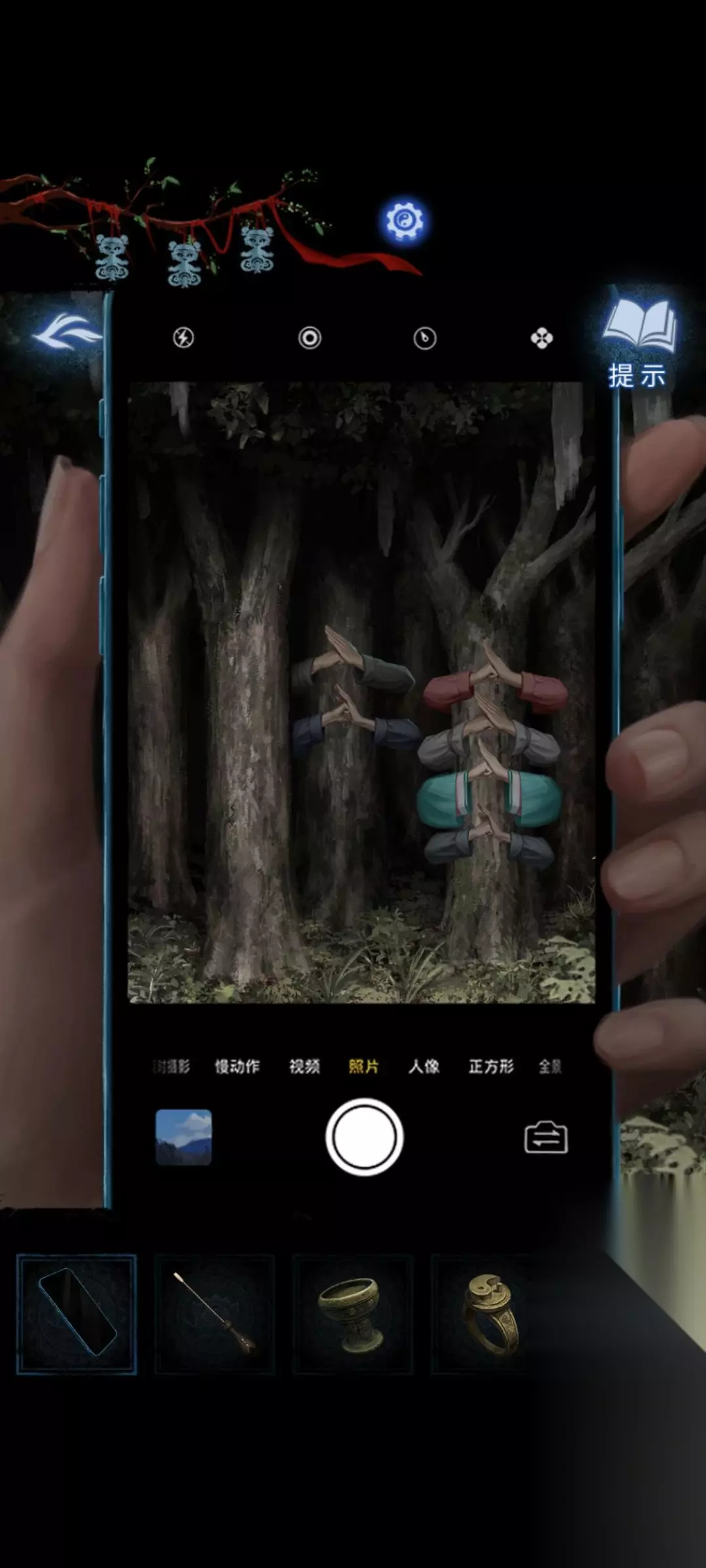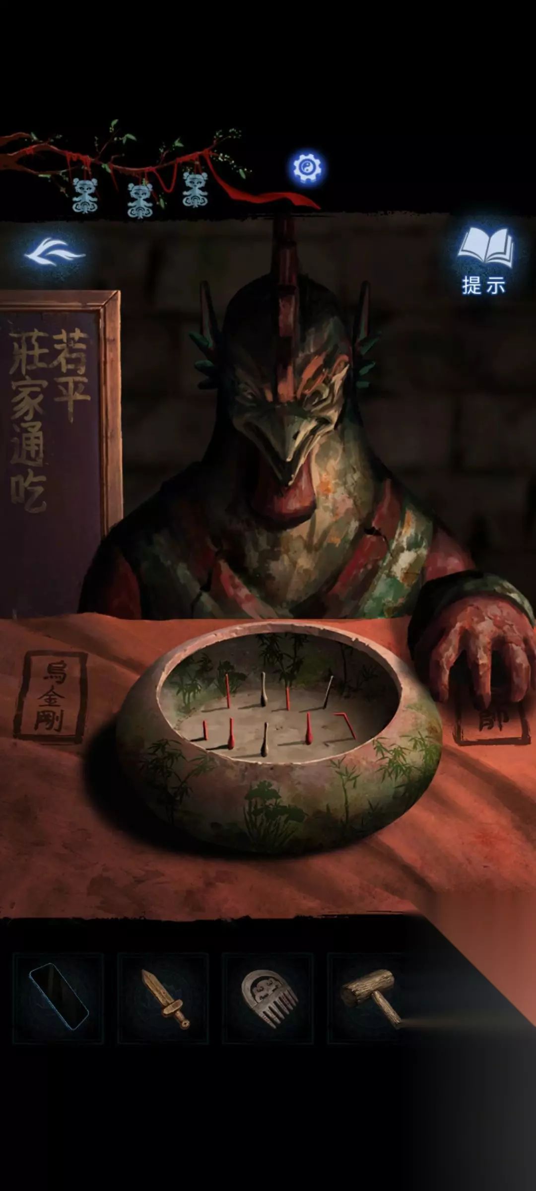 5:将泥塑元宝放置在场景中间偏右的鸡神像前方的桌子上,(压左压右都可以,只是动画不一样)退出场景,用手机观察触发剧情,剧情结束后用手机观察进行小游戏。完成后获得樟柳神。