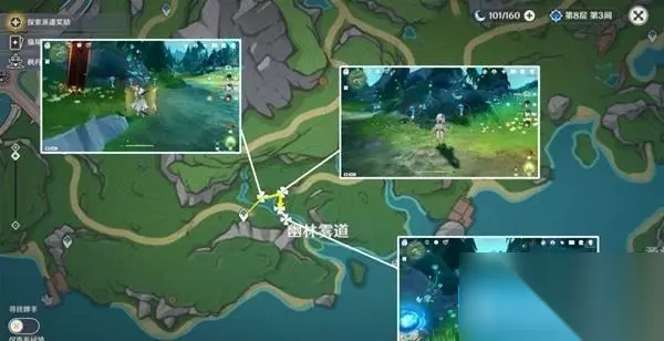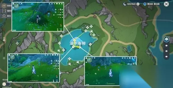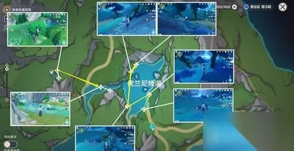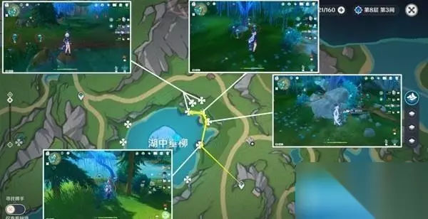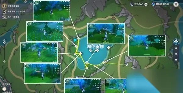 路线三:共计9个 该部分路线四、路线五需要注意,标记为禽肉点位需要完成世界任务「伊黎耶的野精灵」系列任务(茉洁站喷泉处接任务),才会完全显示出来,湖中垂柳中心岛上有七个都需要完成任务才会显示。