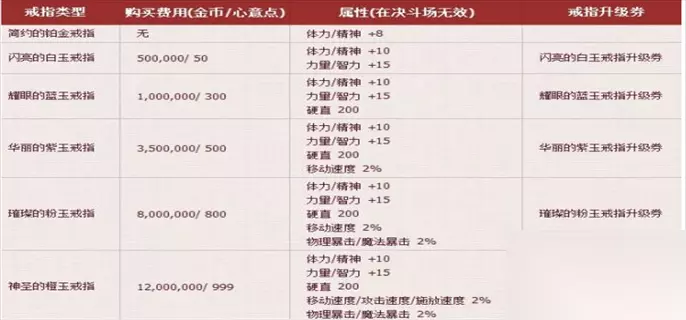 在游戏中,玩家想要结婚需要用到结婚戒指,一共有六种结婚戒指,很多小伙伴想要知道下面233乐园为各位小伙伴整理出,希望可以帮助到你。 1、简约的铂金戒指:体力/精神+8 2、闪亮的白玉戒指:体力/精神+10,力量/智力+15 3、耀眼的蓝玉戒指:体力/精神+10,力量/智力+15,硬直200 4、华丽的紫玉戒指:体力/精神+10,力量/智力+15,硬直200,移动速度2% 5、璀璨的粉玉戒指:体力/精神+10,力量/智力+15,硬直200,移动速度2%,物理暴击/魔法暴击2% 6、神圣的橙玉戒指:体力/精神+10,力量/智力+15,硬直200,移动速度/攻击速度/释放速度2%,物理暴击/魔法暴击2%