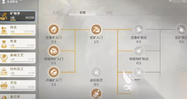 对于基础的装备精炼材料,在游戏初期主要获取途径之一便是挖矿,玩家可通过投身于矿物学生活职业,开启获取特定矿石的大门,当玩家选择矿物学后,在专精页面会呈现出三个技能,每个技能分别对应着巴鲁矿石、阿兹特矿石,玩家可先从入门技能着手,巴鲁矿点击技能对应的信息后,系统会提供追踪功能,玩家能快速定位巴鲁矿所在位置,随后通过追踪传送,便能直接抵达附近的传送点,从而开启挖矿作业。