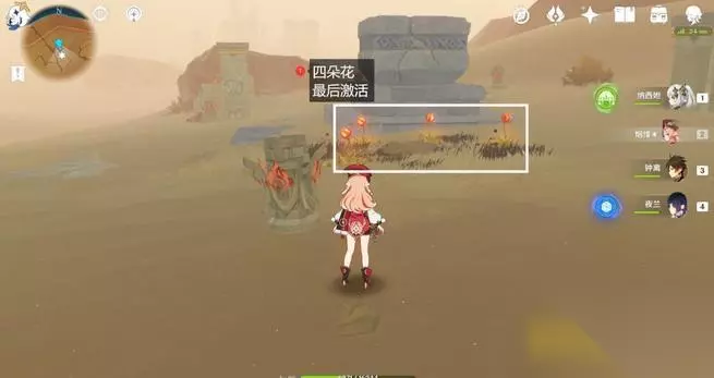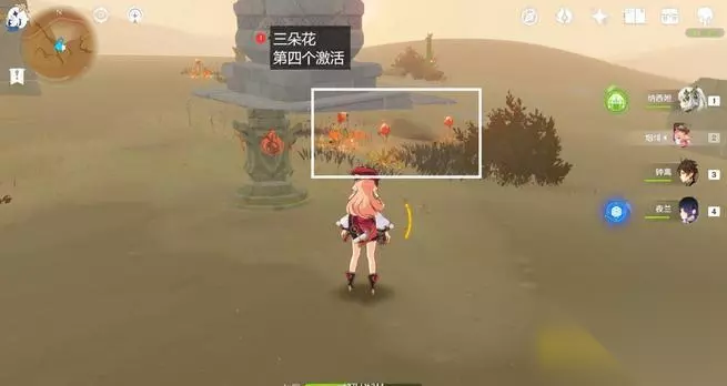 第四个火元素方碑周围空地上有三朵烈焰花,激活后越过秘境就能看见四朵烈焰花的第五个。