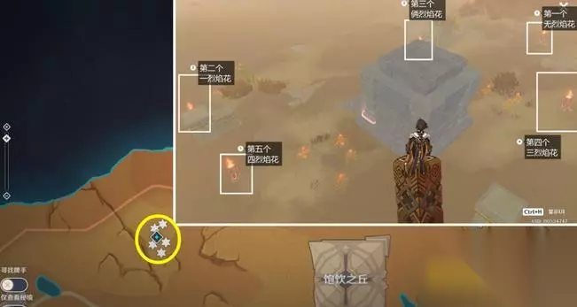 此解密需要按0、1、2、3、4的烈焰花顺序激活火元素方碑,就是从没有,一个,两个这样顺序依次激活,下图为总览。