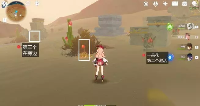第二个点亮前注意,周围是一朵烈焰花与一个仙人柱,如下图,激活后直接去西侧旁边的仙人柱处即可看见第三个。