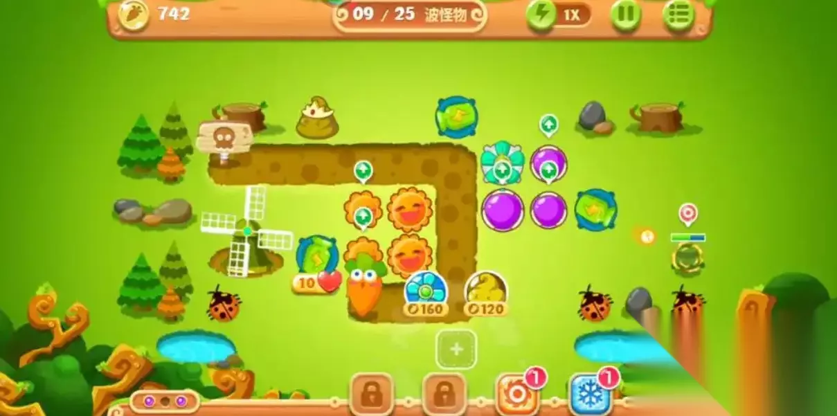 保卫萝卜2第17关攻略 策略布局:前期:尽早在起点周边和拐点处布局防御塔,应对前期怪物并控制其速率。中期:根据怪物种类和数量调整布局,对飞行怪物布局防空塔,对高血条怪物提升高攻击力塔。后期:关注防御塔升级和维护,提升攻击力和射程,保证其持续作用。具体操作:在甲壳虫上方和中间各放一台风扇并升级,做掉甲壳虫获得绿瓶子,升级后进攻大松树。第一颗大松树倒地后,把太阳升满级进攻第二颗大松树,完成99秒内清除2颗大松树的额外任务。打出来4个星星,在太阳升满之后升级,进攻左上角的大松树。在怪出口正后方放一台风扇并升级,清除左边道具,升级魔法球,清理右边道具。有钱后继续放塔和优化,注意减速风扇数量不超过3个,可适当修建便便塔加强减速控制。注意事项:合理利用道具,如炸弹、冰冻等,对怪物造成大量损害或控制其挪动。密切关注怪物动向,及时调整防御塔布局和策略。维持经济平衡,合理分配金币用于修建和优化防御塔。