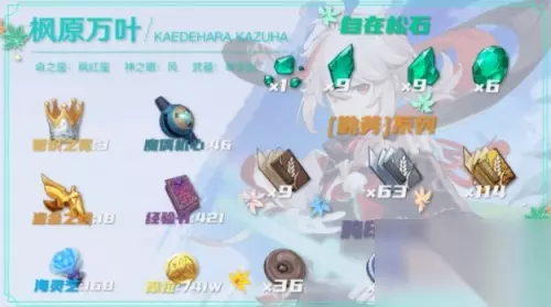 原神枫原万叶突破材料 突破材料: 1、自在松石系列:通过打无相之风掉落; 2、勤劳系列:棕色9本、银色63本、金色114本 3、鸦印系列:棕色36个、银色96个、金色129个; 4、海灵芝:168个