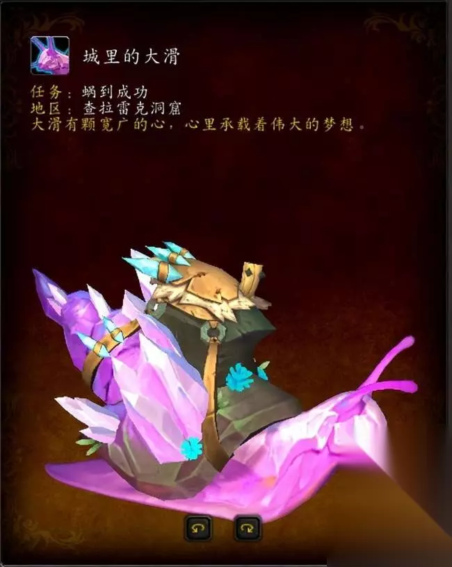 3.城里的大滑 来源:10.1养成坐骑,格里梅罗格竞速者声望达到五级后的任务“蜗到成功”奖励,该声望共五级,每级需要700点声望,布鲁古尔(/way 44.2 79.9)会提供相关任务,每天一个任务奖励100声望,需要一个月时间升满 描述:大滑有颗宽广的心,心里承载着伟大的梦想。