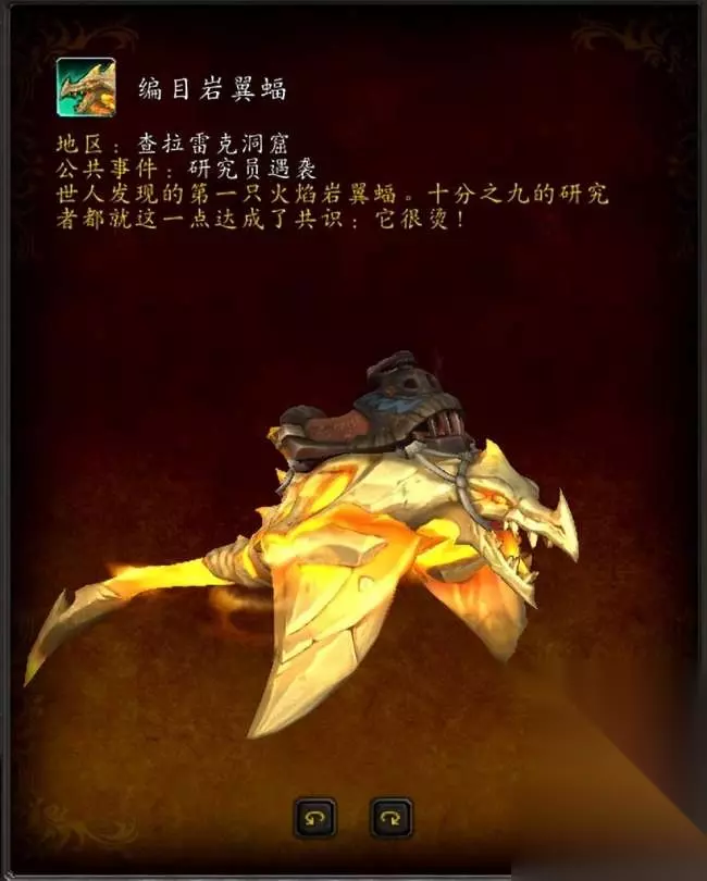 8.编目岩翼蝠 来源:查拉雷克洞窟公共事件:研究员遇袭奖励,可能在研究员遇袭事件奖励包裹:研究员的礼物中开出 描述:世人发现的第一只火焰岩翼蝠。十分之九的研究者都就这一点达成了共识:它很烫!