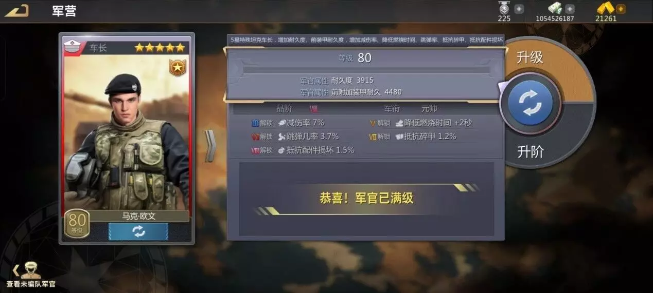 战神车长马克.欧文是所有战神军官中最值得优先弄的,虽然你弄了后会发现并没有想象中那么强,但加成还是很大的,除了减伤跳弹耐久之外还能提供减少2秒燃烧时间,让你不被烧太久