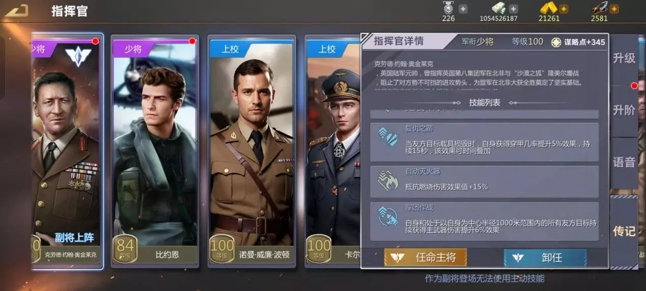 指挥官的话我下期详细介绍平民的搭配,副将比起比约恩,我更推荐用克劳德.约翰.奥金莱克,首先他能提供15%的抗燃,其次他的军团作战不但能给队友提供加成还能给自己提供加成,并且梅5本来就是靠火炮输出的,军团作战相当于给梅5增加了6%火炮攻击额外伤害倍率