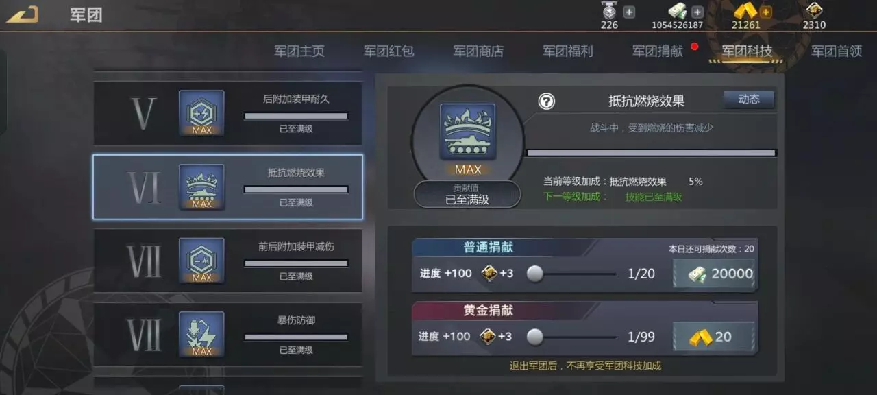 我们可以看到军团加成中有一个是5%的抗燃