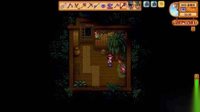 2.然后我们上到小屋,喂给里面的鹦鹉触发剧情,然后北部区域就会解锁,接下来让我们用斧头对着旁边的树敲一下,就会再获得1个金核桃