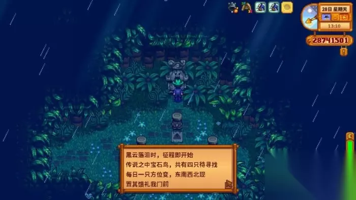 4.接下来就是宝石鸟的解密,我们可以点击石像查看线索,意思就是说下雨的时候,会有宝石鸟出现,三角形(火山)标志代表着北部区域,椰树标志代表丛林神庙(东部),海浪标志代表度假村区域以及东南部区域,圆形标志代表西部(农场那边),每当下雨的时候,宝石鸟会随机出现在这四个地方的其中一处,我们找到并且靠近它,它就会落下一颗宝石,样子很好认的,宝石一共有五种,分别是海蓝宝石,黄水晶,紫水晶,绿宝石,红宝石,所以当我们确定其中两个宝石答案后,就可以拿剩下的三种宝石去试错,最多6次即可成功破解,获得5个金核桃