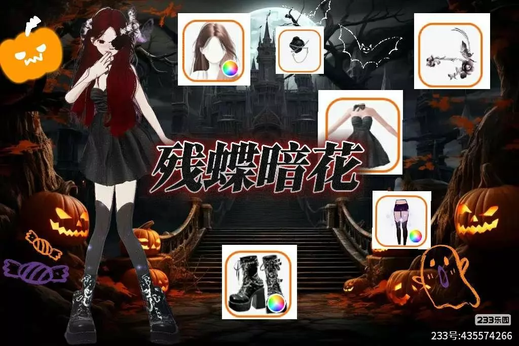 - 配饰细节:红发间点缀的蝶形发饰+花朵装饰,呼应“残蝶暗花”的主题,眼部的黑蔷薇装饰+链条设计,为甜感注入诡谲破碎感;