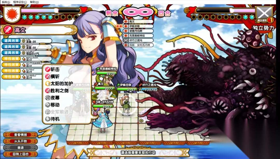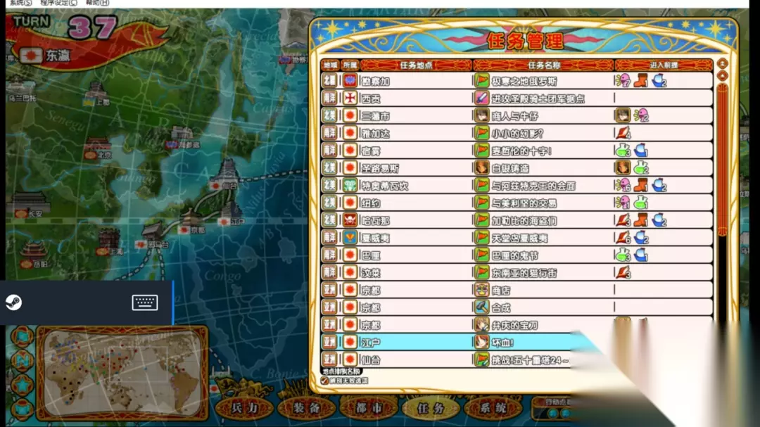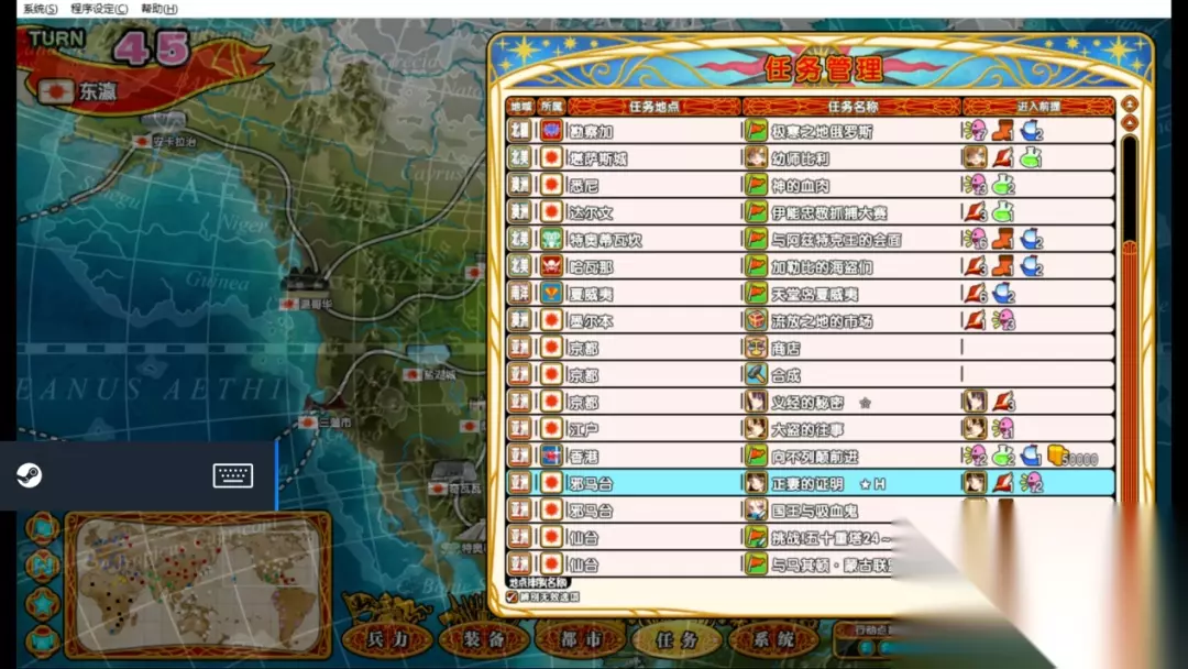游戏中玩家需要从一个城池不断扩张最后征服世界,在一周目玩家开始只有两个行动点,最后会增加到四个行动点,行动点唯一的作用就是完成任务,你会发现你每回合除了完成任务似乎没什么能做的事,一个纯靠任务驱动的策略游戏显然要无趣许多。我很少见到《英雄战姬Gold》这种攻城模式,作为一个征服世界的游戏你的敌人居然全部处于静态模式。只要玩家不在任务界面跟国家宣战,无论多少回合AI都不会向你主动进攻,2回合和200回合敌人的兵力都不会发生巨大变化。 同理玩家不扩张版图也没什么事可做,制作组可没有在家里给你放置个训练场,只靠在家闭门造车把兵力堆起来实在是太费时间,玩家需要占下城池获得更多的任务,完成的任务越多经济越好兵力越高,英雄的技能也越多,还能用富余的金钱去提升自己的兵力,去商店里买宝物和合成宝物。所有的经济和道具都来源于完成任务玩家不需要发展城市、不需要造兵、不需要搞外交。往好的方面想玩家可以玩的特别休闲,没有任何敌人在你摸鱼的时候给你压力。
