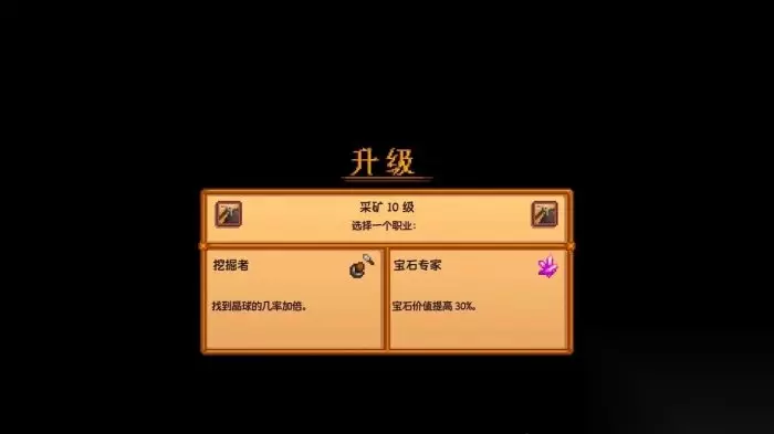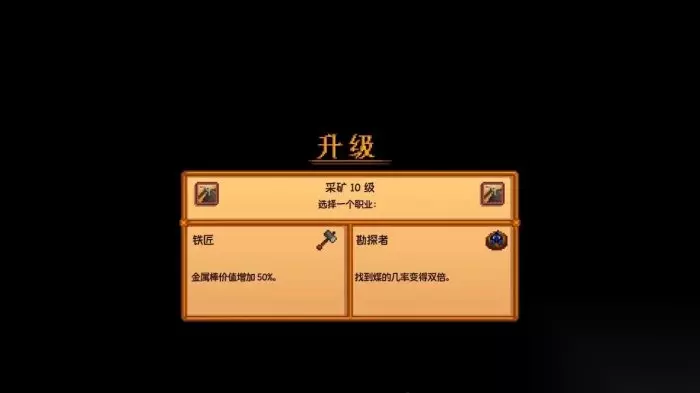 铁匠: 金属棒价值增加50%(铜锭、铁锭、金锭、铱锭、放射性矿锭的价值增加50%) 勘探者: 找到煤的几率变得双倍(煤的掉落几率变为双倍) 选择地质学家后的十级专精选项