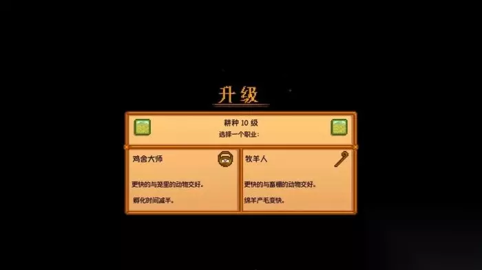 鸡舍大师: 更快的与笼里的动物交好。孵化时间减半(抚摸鸡舍类动物增加的好感度为双倍,所有的孵化时间减半,包括鸵鸟与史莱姆,恐龙等) 牧羊人: 更快的与畜棚的动物交好。绵羊产毛变快(抚摸畜棚类动物增加的好感度为双倍,绵羊产毛的时间-一天) 选择农耕人后的十级专精选项