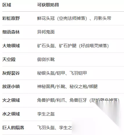 王之财宝防具收集攻略 此为防具收集部分,共计52个: 一、初始装备(3件) 月光头带:角色初始自带 月光礼服:角色初始自带 月光长靴:角色初始自带 二、安息小镇(铁匠/商人出售) 冒险家套装 冒险家护额:铁匠「马丁」出售 / 翡翠瀑布拾取 冒险家皮衣:铁匠「马丁」出售 / 霸王蛛猴(翡翠瀑布)掉落 冒险家皮靴:铁匠「马丁」出售 / 翡翠瀑布拾取(仅单只) 守护骑士套装 头盔/铠甲/护腿:均通过铁匠「马丁」购买 鲜花套装 鲜花衣裙/长靴:商人「塔克」出售 / 彩虹原野拾取 三、任务奖励与特殊掉落 莱文任务系列 白枭的风帽:「请求」任务奖励 白枭的漫步:「激活」任务奖励 猫头鹰套装(兜帽/礼服/拖鞋):「自由」任务后于古董店购买 BOSS与敌怪掉落 矿石铠甲:击败「巨矿羊」(大地领域遭遇战) 月影长靴:击败「颂诗班成员」(泪湖基地BOSS) 御剑之簪:「墨形」(天空殿敌怪)掉落 秘仪面具:「扭曲墓碑」(放逐小镇敌怪)掉落 四、区域拾取防具汇总