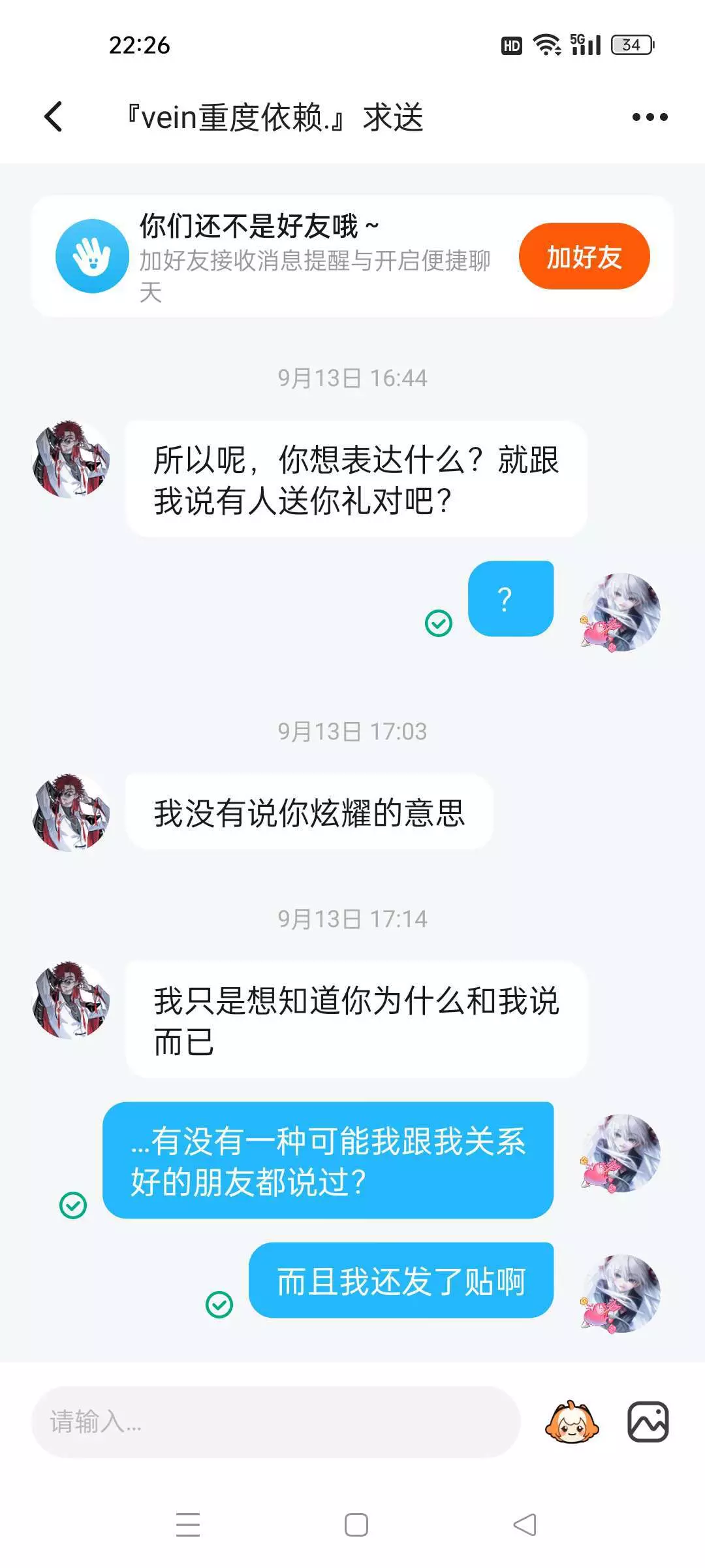 事情呢起源于一个游戏,明明是你先加我说能做朋友吗?我答应了,所以呢?玩这套,呵呵真有意思