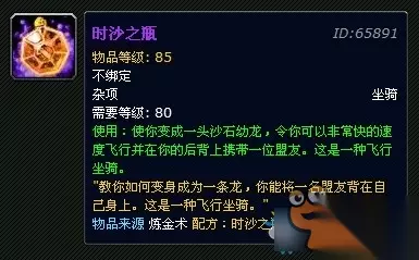 时沙之瓶是大灾变版本中的炼金制作物品,可以让玩家变成一头沙石幼龙,而且可以携带一位玩家,可以算是魔兽世界中首批可以载人的飞行坐骑了,但是由于制作成本太高,很多玩家的望而止步,但是现在熊猫人版本中入手一只已经不是梦了,下面简单介绍下制作配方。 时沙之瓶—大灾变版本中炼金制作物品(炼金525可学习) 时沙之瓶—燃钢水晶瓶+时之砂*8+真金*12+风行合剂*8+泰坦之力合剂*8+深石之油