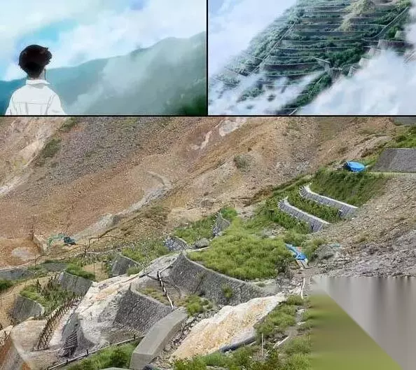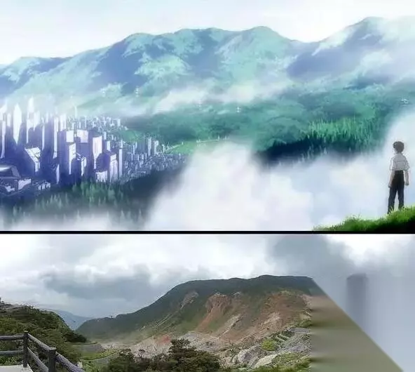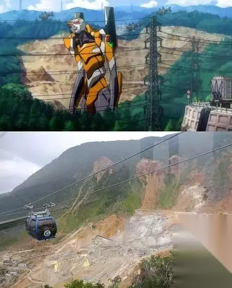 真嗣在山上远望第3新东京市。而现实中,山下并没有未来科幻都市。