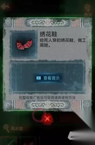 10、打开大门后我们进去在墙上获得风水剑,回棺材那,用风水剑剪开红绳即可获得绣花鞋。