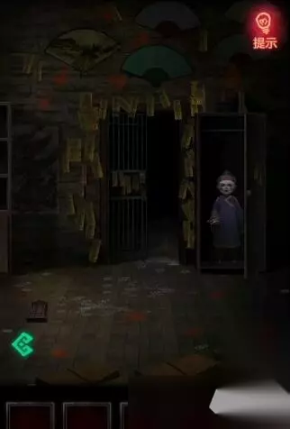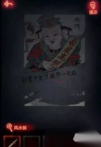 11、我们到纸人那点击后面年画,用宝剑打开画获得密码提示,密码是地下室上面扇子的密码。