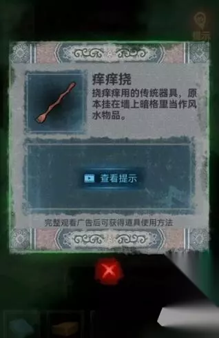 4、我们到地下室前往右边,点击书架第三层书籍获得一些提示,根据提示点开墙获得痒痒挠。