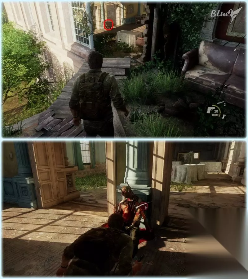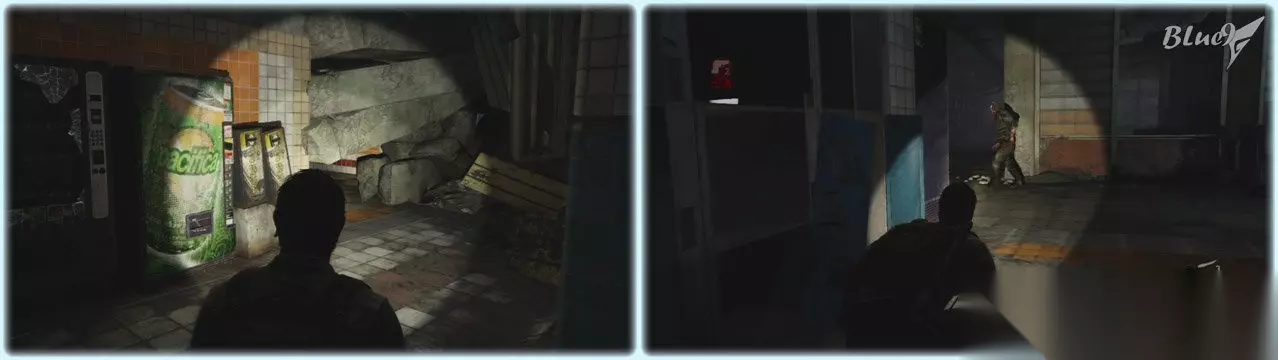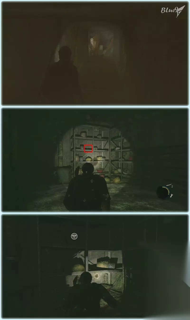 到达这里由于地形问题不能和敌兵肉搏,扔个砖头瓶子吸引敌人注意力后可以从左侧的楼梯迅速脱离 之后屋里有些补给品,搜刮一番拉开百叶门出去