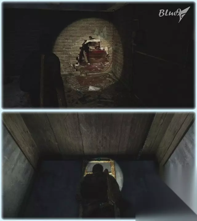 出了房间,这里敌人很多,小蓝第一次这里没有打,先跑到右前方的残破建筑物里,向左边扔个瓶子或砖头,然后就一直向前跑,直到跳进图2的大坑