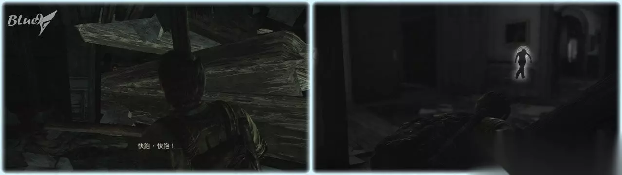 这里的几个跑者先干掉2边的,然后是中间来回走的,最后是柱子边站着的;消灭敌人后从坍塌处上楼,拉开挡门的障碍,屋子内有些补给
