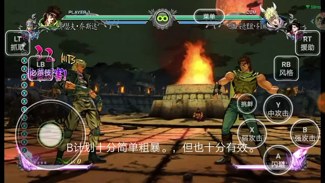 这是《JOJO的奇妙冒险 群星之战》的连招教程,展示了空条承太郎对战DIO的连招操作,包含冲刺接轻中重拳、冲刺前跳中拳接下蹲重拳等连招技巧,呈现了高连击的战斗画面。