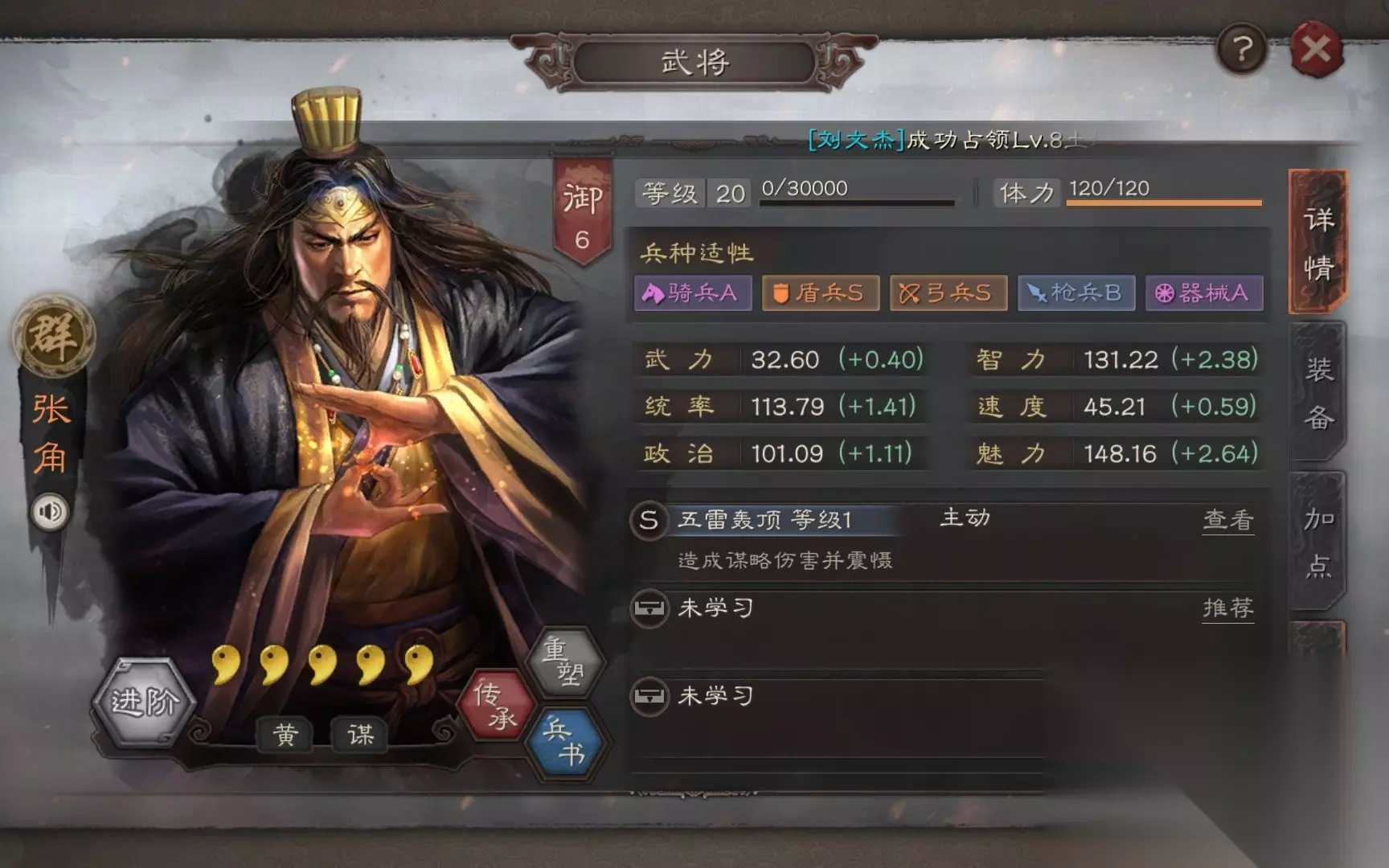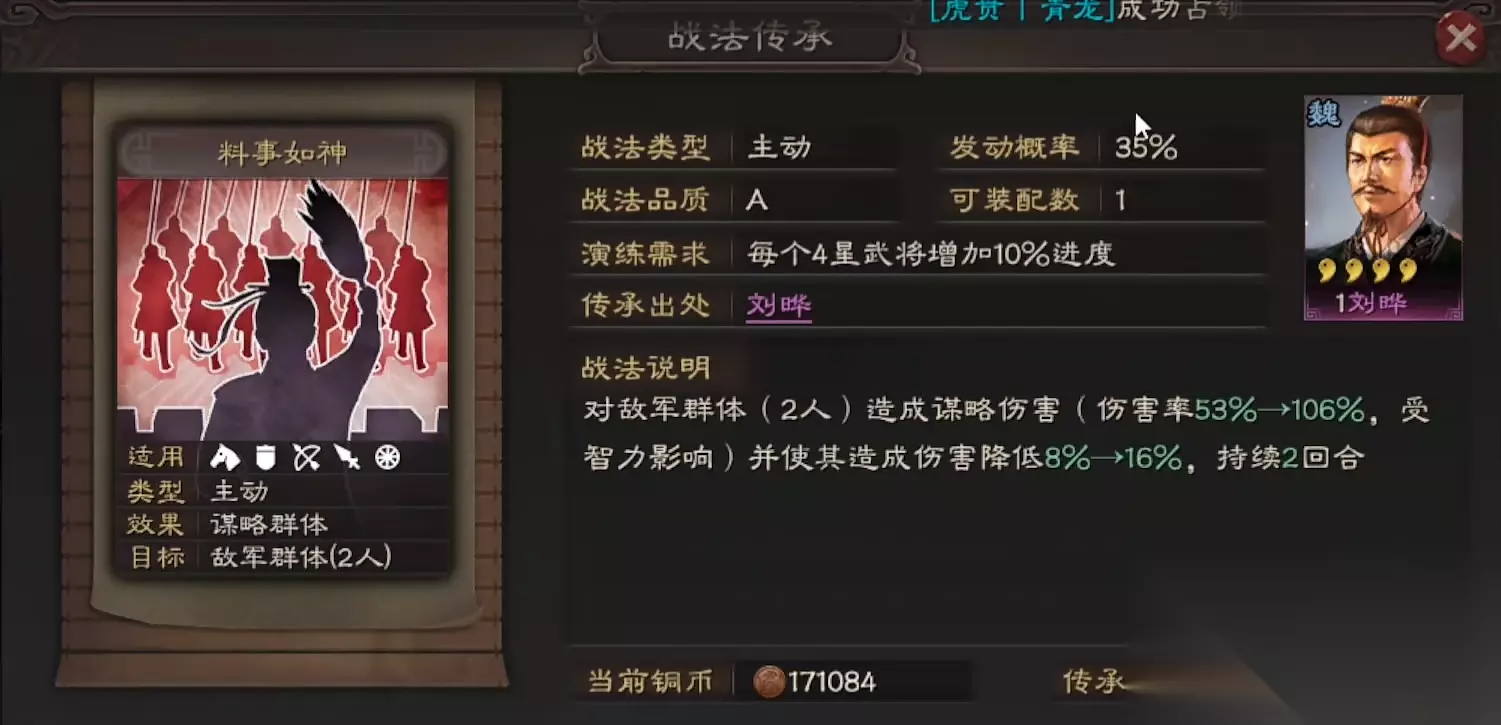 从战法适配性来看,张宝可学习落雷、料事如神等带有减益效果的谋略战法,进一步强化输出与控制能力。落雷能提升敌方受到的谋略伤害,料事如神则可降低敌军输出,这种组合能有效弥补四星武将属性成长的不足。其可拆战法妖术具有战略价值,可为其他谋略型武将提供群体伤害手段。在兵种适性方面,弓兵S级与盾兵A级的配置,使其既能融入速攻阵容也可担任持久战角色。