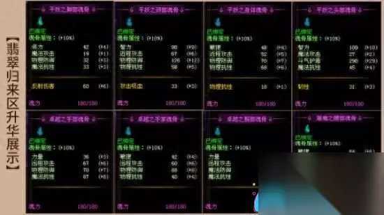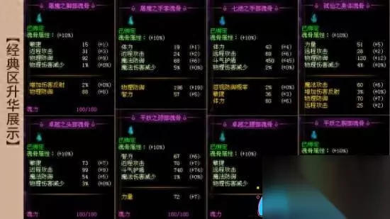 【功效】满级属性超越进阶 据悉,每块魂骨最高可升华至20级,每次升华都能提升魂骨属性的10%;而若将魂骨升华至满级20级,将使魂骨原有属性提升200%。轻松而简单的操作,就能使属性提升200%,让战力飞升成为现实。快来让你的魂骨焕发出全新的光彩吧!