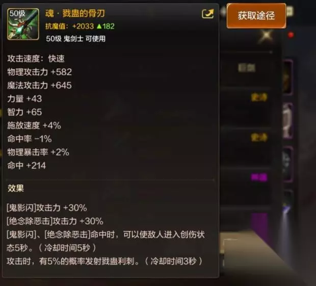 2、魂·戮蛊的骨刃 魂·戮蛊的骨刃的特殊效果是影闪的攻击力+30%,绝念除恶击的攻击力+30%,鬼影闪、绝念除恶击命中时,可以使敌人进入创伤状初始化态5秒。(冷却时间5秒),可以通过制作获取该武器。