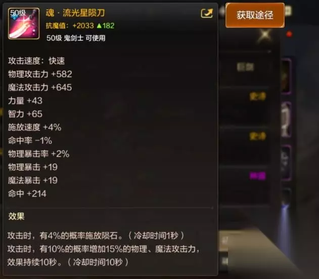 dnf手游鬼剑士史诗太刀获取方法汇总: 1、魂·流光星陨刀 魂·流光星陨刀的特殊效果是攻击生命值50%以上的敌人时,有5%的概率使敌人减少700点物理防御力,效果持续5秒。攻击时,有5%的概率施放激者之怒,效果持续10秒。可以通过制作获取该武器。