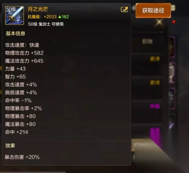 4、月之光芒 月之光芒的特殊效果是暴击伤害+20%,基本属性是攻击速度+4%,施放速度+4%,命中率-1%,物理暴击率+2%,物理暴击+80等等。玩家可以通过制作、委托、深渊、道具中的祥瑞之匣获取该武器。